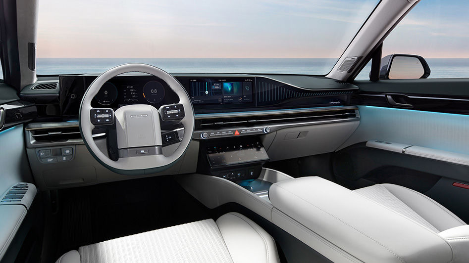 실내는 12.3인치 디지털 계기판 및 디스플레이로 구성된 점이 특징이며 그 밖에 와이드 디스플레이, 10.25인치 통합 공조 컨트롤러, 컬럼타입 전자식 변속 레버 등이 기존 그랜저와 다른 새로운 레이아웃입니다. 특히 1세대 그랜저의 향수를 담은 원 스포크 스타일 스티어링 휠이 눈에 띄는 특징이라고 볼 수 있습니다.