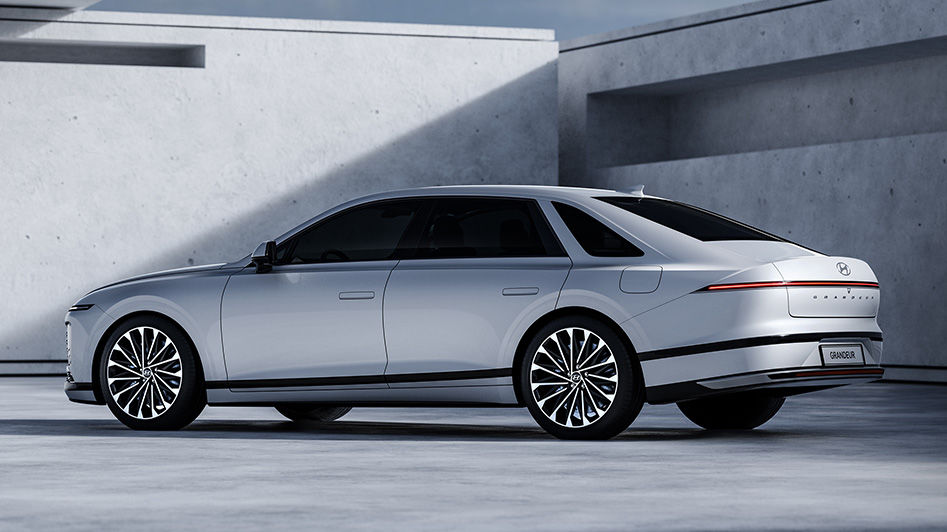 그랜저 하이브리드 측면부는 그랜저 XG 이후 처음으로 프레임리스 도어와 플래그 타입 사이드미러가 적용되어 있는데요, C필러 오페라 글래스는 1세대 그랜저의 대표적인 오마주 디자인이라고 말할 수 있으며 후면부 테일램프는 기존과 유사한 스타일로 방향지시등은 범퍼에 배치되어 있습니다.