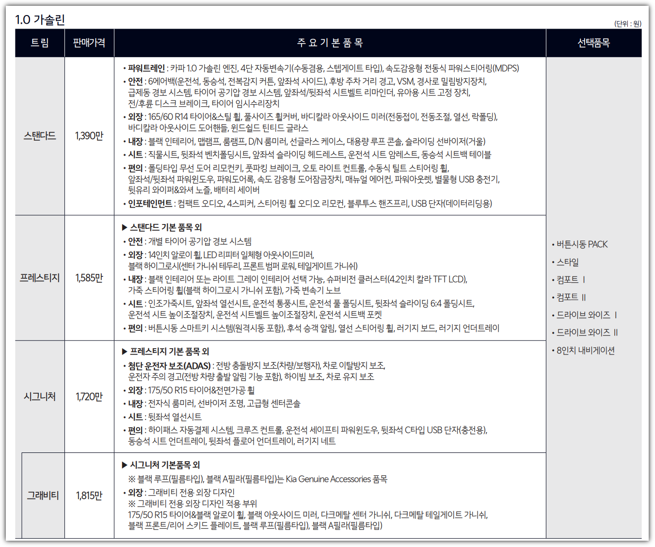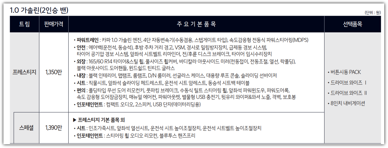 트림별 가격 (※ 경차는 개별소비세 비과세 대상)