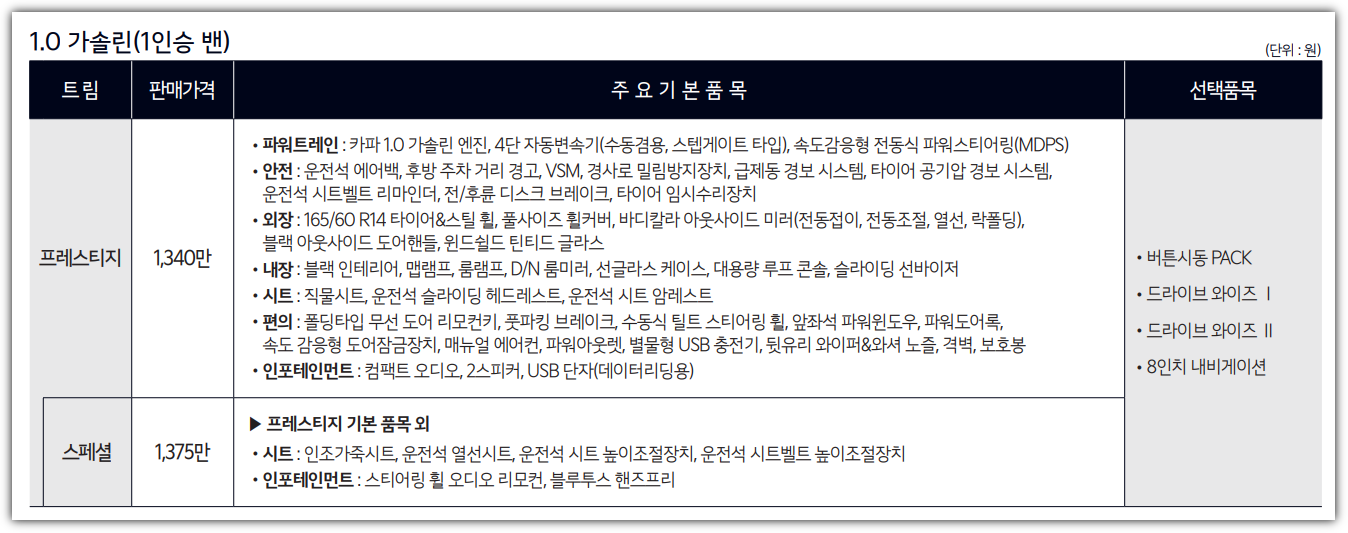 트림별 가격 (※ 경차는 개별소비세 비과세 대상)