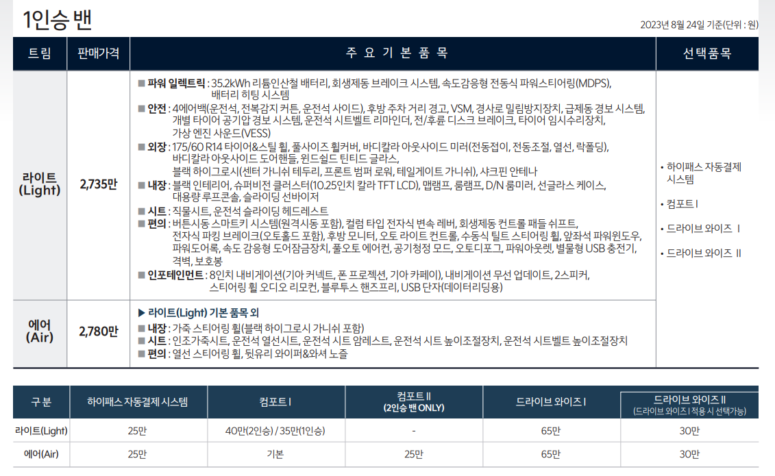 레이 EV 승용과 1/2인승 밴 옵션 구성이 조금 다른데 뒷유리 와이퍼&와셔 노즐은 승용에서는 기본이지만 1/2인승 밴에서는 에어 트림에만 제공된다고 합니다. 반면 스피커는 2개로 승용보다 4개 적으며 기아 레이 전기차 가격을 풀패키지로 할 경우 승용 3080만원, 2인승 밴 2940만원, 1인승 밴 2900만원입니다.