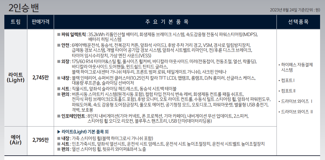 그 밖에 내비게이션 무선 업데이트, 전좌석 파워윈도우, 공기청정 모드, 풀오토 에어컨, 원격 시동이 포함된 스마트키, 회생제동 컨트롤 패들 시프트 등은 지원되지만 크루즈 컨트롤과 차로 유지 보조, 전방 충돌 방지 보조와 같은 ADAS 시스템과 1열 열선 시트는 옵션이며 컴포트 옵션 가격은 70만원입니다.