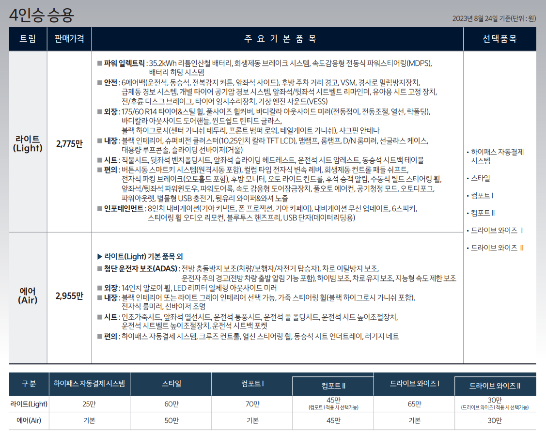 에어 트림에는 크루즈 컨트롤과 차로 유지 보조, 1열 열선 시트, 운전석 통풍 시트 등이 추가됩니다. 라이트 트림에 컴포트와 드라이브 와이즈를 넣은 셈이라고 보시면 되는데요, 여기에 하이패스, 동승석 시트 언더트레이, 러기지 네트, 14인치 알로이 휠, 선바이저 조명 정도가 더 들어갔다는 차이가 있습니다.