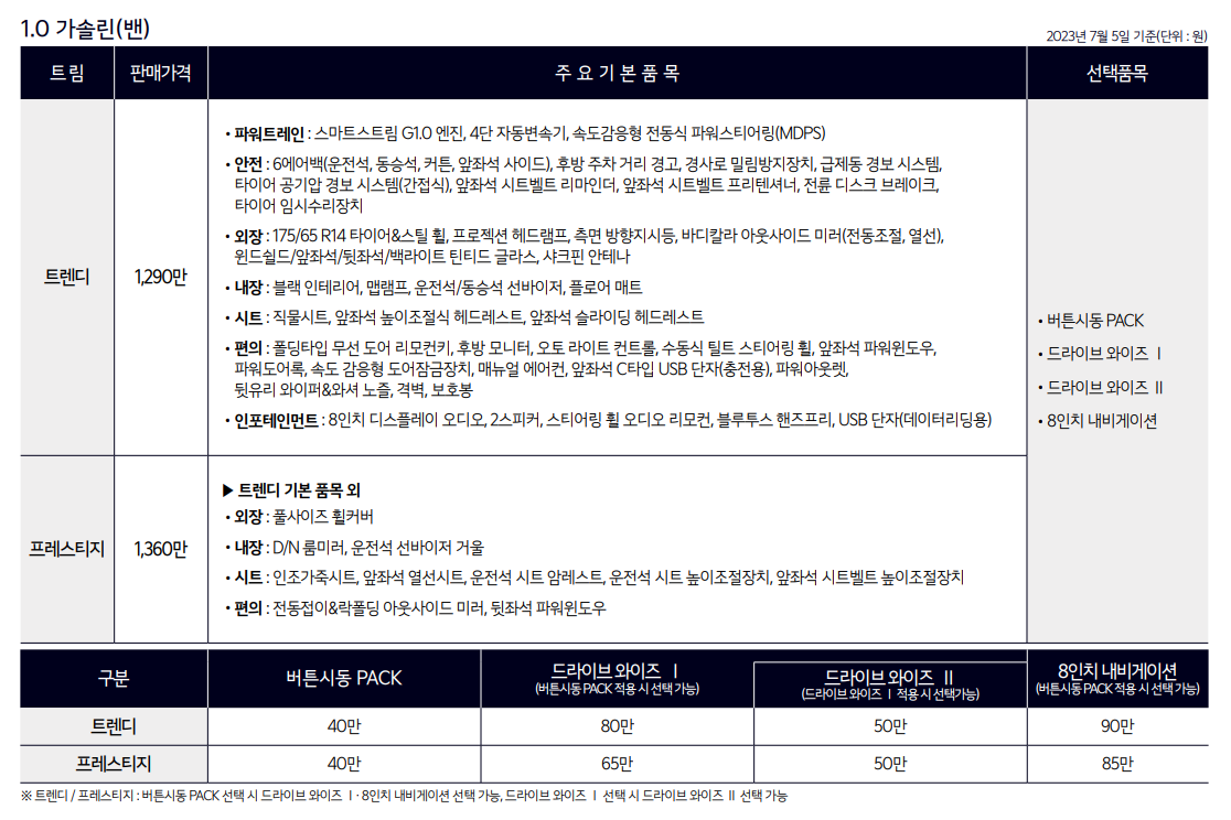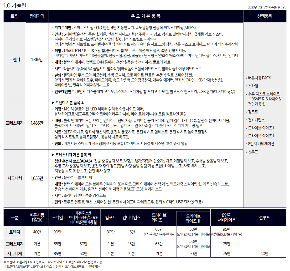 최상위 등급 시그니처 트림의 풀옵션 가격은 1925만원으로 파악되고 있는데요, 기본 가격 1655만원에 옵션인 스타일(85만원), 후륜 디스크 브레이크 및 16인치 전면 가공 휠(50만원), 드라이브와이즈 2(20만원), 8인치 내비게이션(75만원), 선루프(40만원)를 더하면 약 2000만원 정도가 풀옵션 가격이라고 보시면 될 것 같습니다.