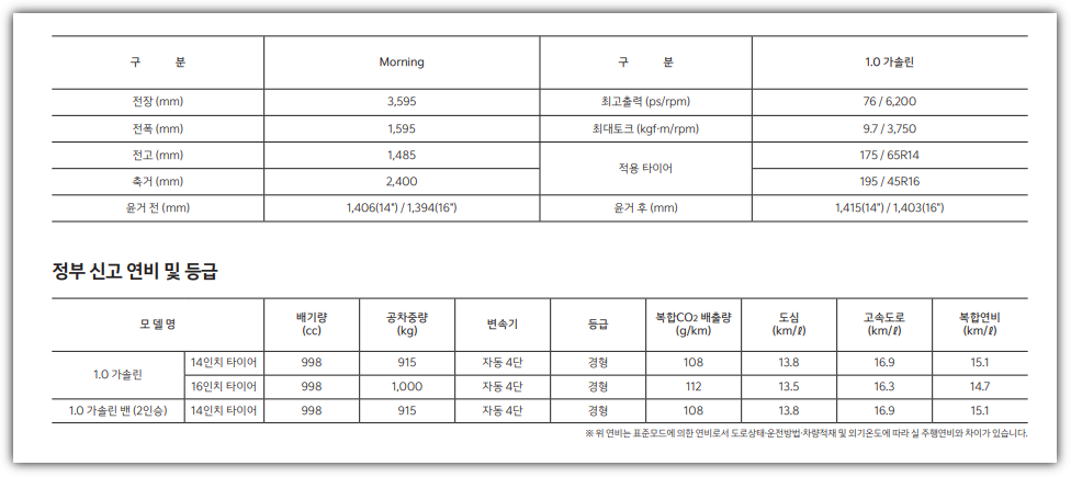 모닝은 가솔린 1.0 엔진과 4단 자동변속기를 조합해 15.1km/ℓ의 복합연비를 갖췄습니다.