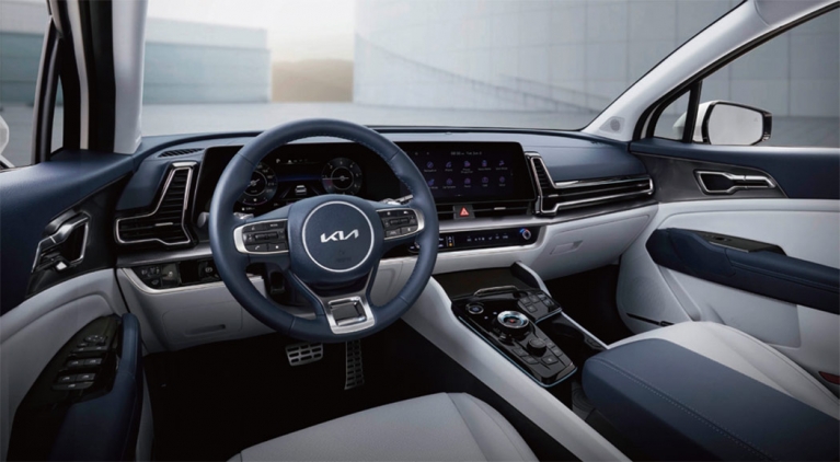 실내는 12.3인치 디스플레이 두 개가 배치되어 있으며 공조기는 터치 방식. 공조기와 인포테인먼트를 하나의 패널에서 조작할 수 있다는 장점이 있습니다. 기아 모델 특유의 다이얼 방식의 기어노브 주변으로 각종 버튼이 자리하고 있는데요, 패밀리카로 사용할 수 있을 만큼 2열은 넉넉한 공간을 자랑합니다. 2열 무릎 공간에 주먹이 두 개 이상 들어가는 정도라고 보시면 되구요, 머리 공간도 여유로운 편입니다.