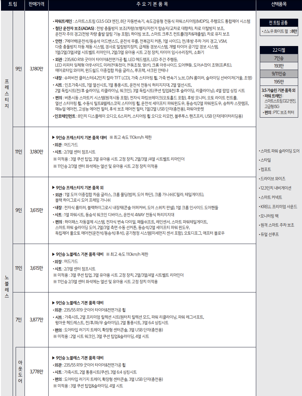 마지막으로 2.2 디젤은 12.3인치 디지털 계기판 및 디스플레이, 앰비언트 라이트, 내비게이션 기반 스마트 크루즈 컨트롤, 고속도로 주행보조, 기아 페이, 내비게이션 무선 업데이트 등 사양이 탑재되며 7인승은 나파가죽시트이니 참고하시기 바랍니다.