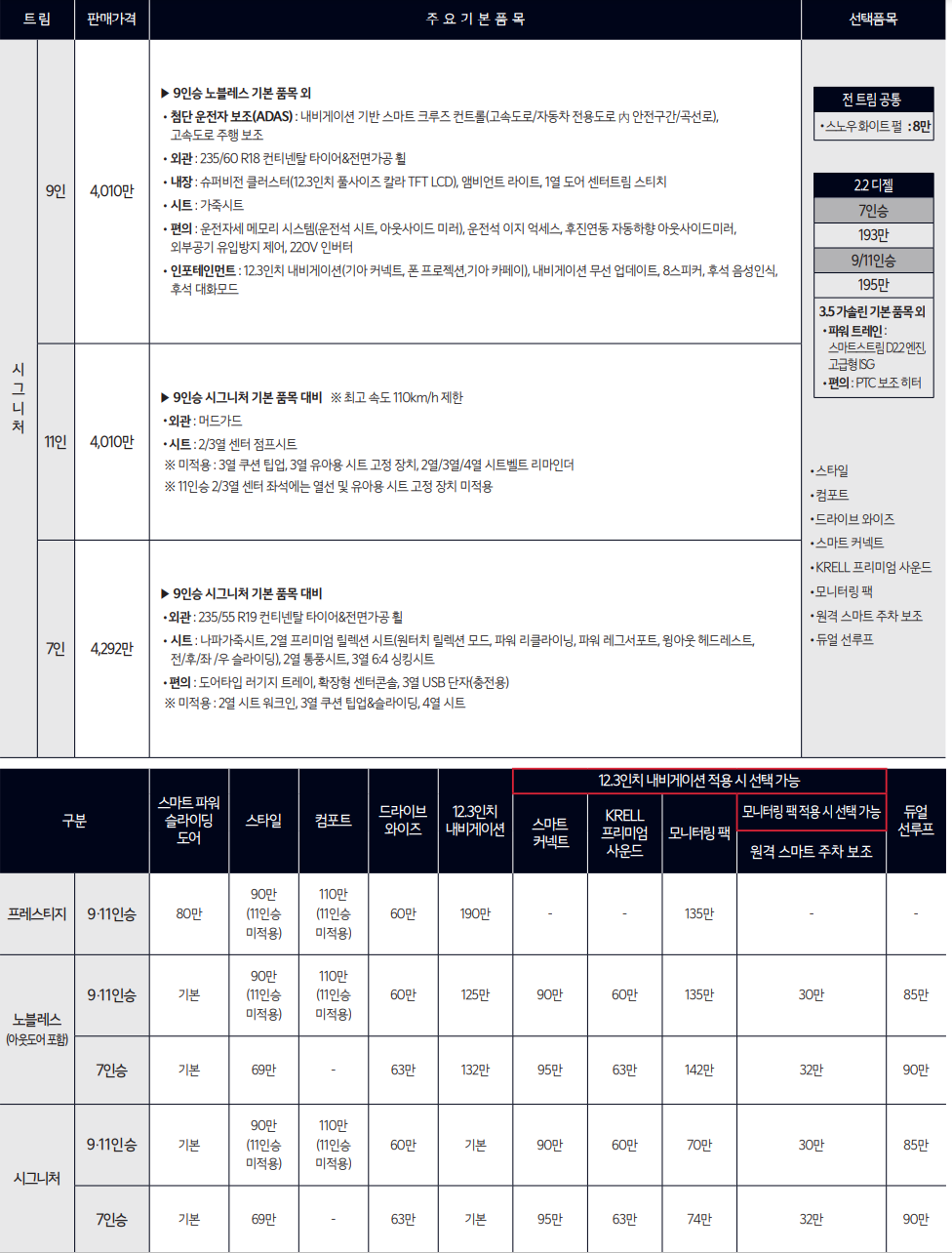 노블레스 트림은 전자식 변속 다이얼(SBW), 패들 시프트, 스마트 파워 슬라이딩 도어, 독립 풀오토 에어컨, 2열/3열 수동 선커튼이 추가되며 7인승 모델에는 19인치 휠과 가죽시트, 도어타입 러기지 트레이, 확장형 센터콘솔, 3열 USB단자가 추가로 적용됩니다. 9인승 및 11인승은 18인치 휠과 인조 가죽시트가 제공되는데요, 최상위는 시그니처 트림입니다.