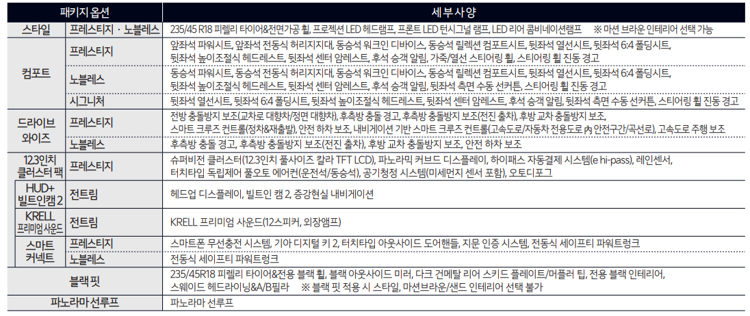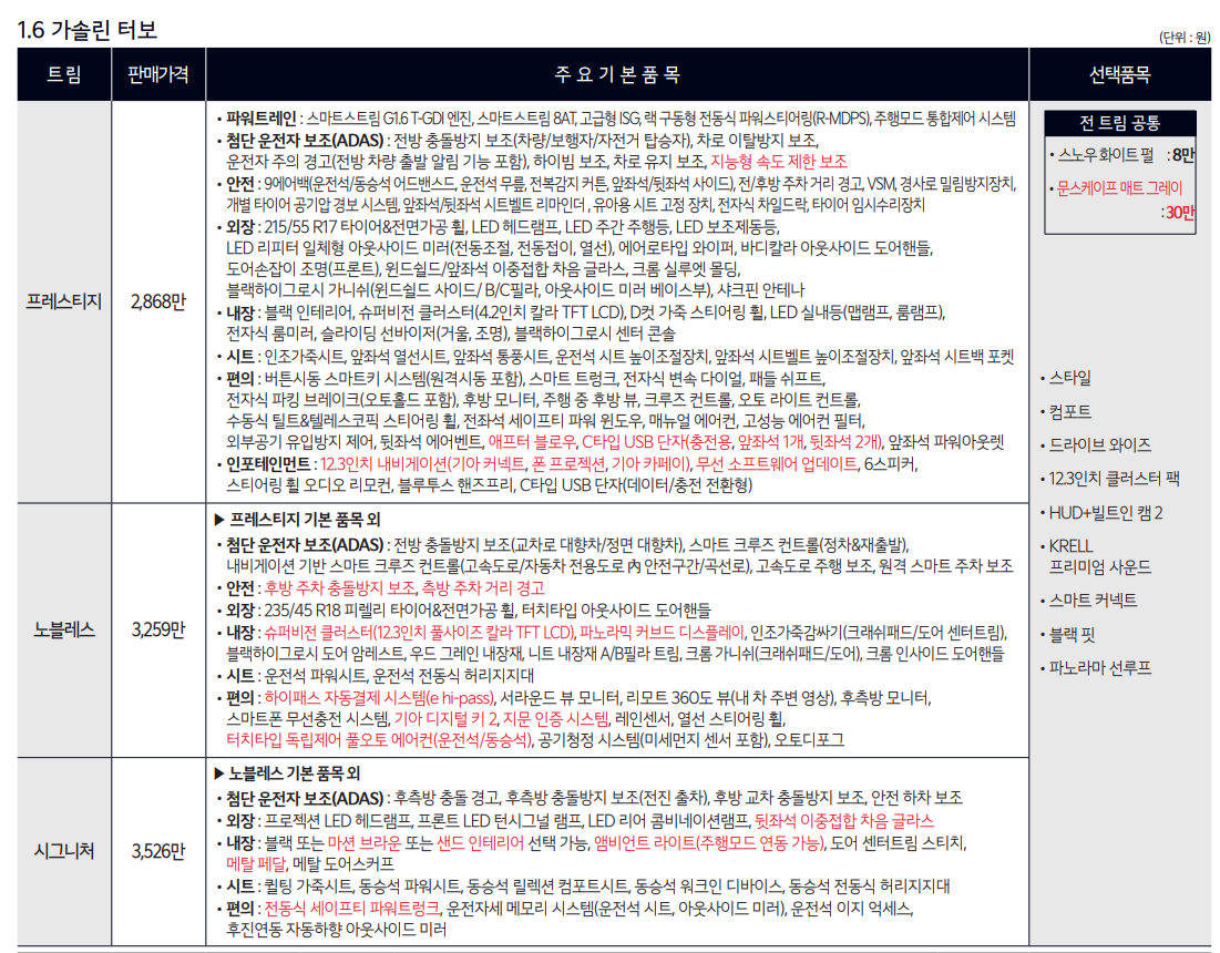 트림 구성은 기존 트렌디를 제외한 프레스티지, 노블레스, 시그니처 3개로 이뤄집니다. 1.6 가솔린 터보 기준으로 기본형 프레스티지(2868만원)에는 180마력 G1.6 T-GDI 엔진과 8단 자동변속기, R-MDPS, 그리고 17인치 휠과 내비게이션, 매뉴얼 에어컨, 애프터 블로우, 스마트키가 기본입니다. 스타일 패키지(119만원)는 가성비 옵션입니다.