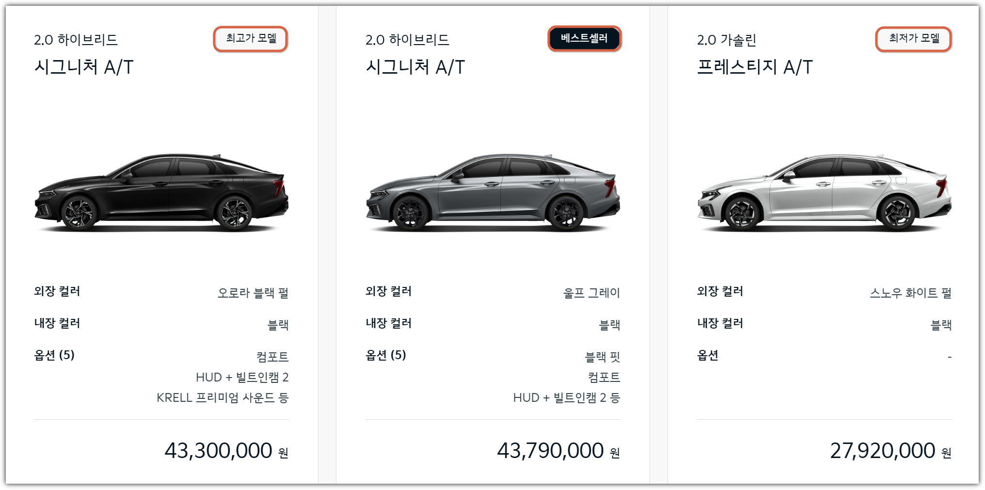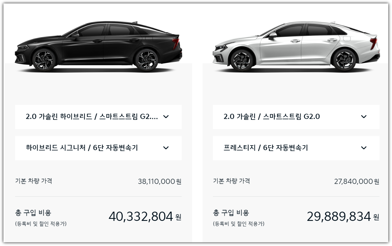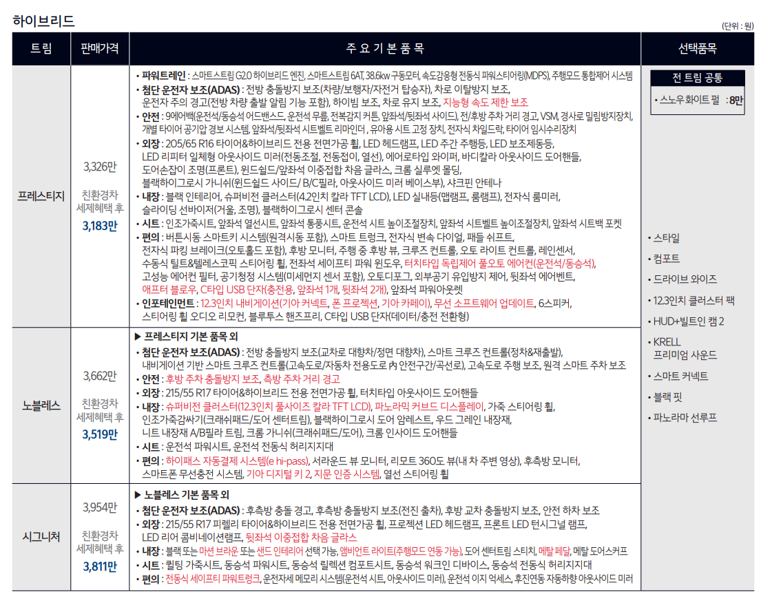 기아 K5 하이브리드 가격표를 좀 더 자세히 살펴보면 우선 세제혜택 적용 후 가격은 프레스티지 3183만원, 노블레스 3519만원, 시그니처 3811만원입니다. 기존 K5 하이브리드와 비교해 최하위 트림 트렌디 삭제로 시작 가격은 406만원 오른 것인데요, 동일 트림 기준으로는 각각 208만원, 351만원, 427만원 인상됐습니다.