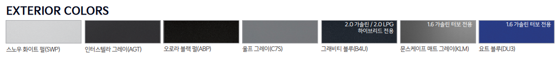 블랙핏 전용 디자인은 블랙 아웃사이드 미러, 다크 건메탈 리어 스키드 플레이트/머플러팁, 19인치 블랙 휠(2.0 가솔린과 하이브리드 18인치), 그리고 전용 블랙 인테리어, 블랙 스웨이드 헤드라이닝&A/B 필라가 더해지며 블랙 아웃사이드 미러에는 펄이 적용되지 않는다고 하니 참고하시기 바랍니다.