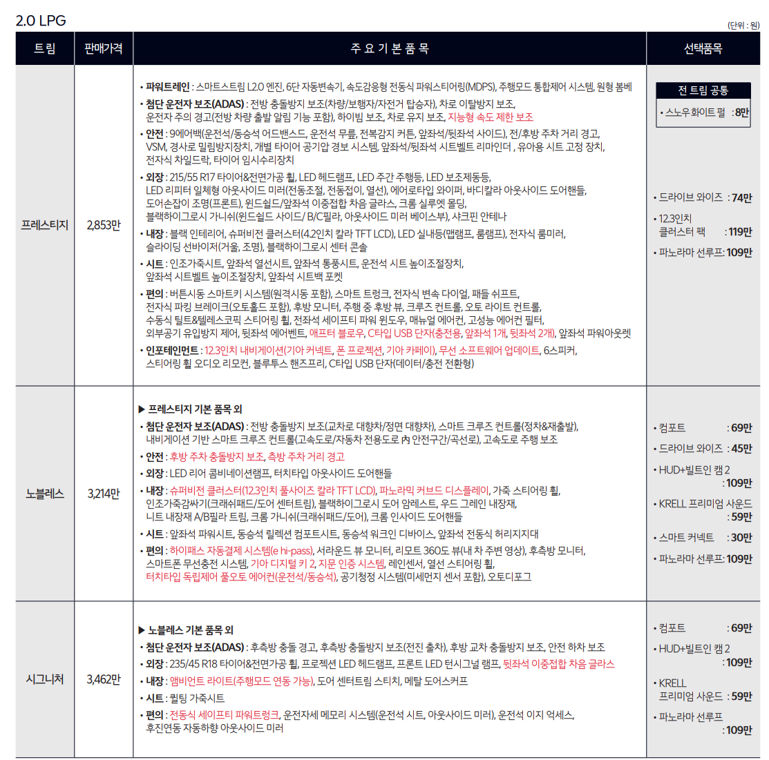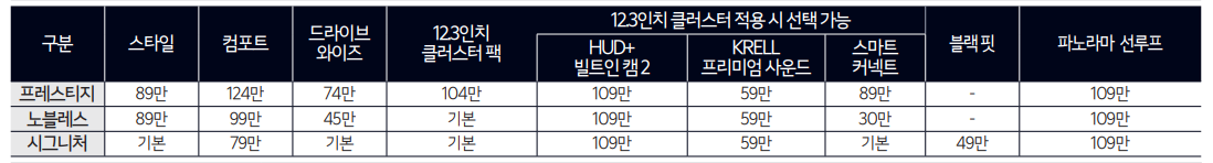 노블레스(3259만원)에는 스마트크루즈컨트롤, 측방주차거리경고 등 최신 ADAS 시스템과 18인치 휠, 12.3인치 클러스터, 커브드 디스플레이, 인조가죽감싸기, 우드그레인, 크롬 가니쉬, 풀오토 에어컨, 360도 카메라, e-하이패스, 지문인증, 열선 스티어링 휠이 더해졌습니다.