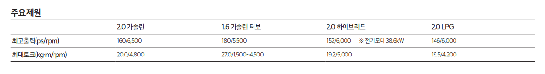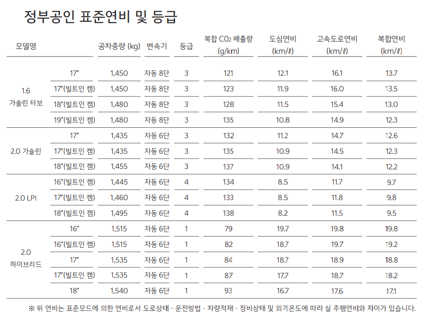 하이브리드 전용 6단 자동변속기와 전기모터 등이 조합돼 총 출력은 195마력이며 복합연비는 16인치 휠 기준 19.8km/ℓ(도심 19.7, 고속 19.8), 17인치 휠 기준 18.8km/ℓ(도심 18.7, 고속 18.9), 18인치 휠 기준 17.1km/ℓ(도심 16.7, 고속 17.6) 수준으로 쏘나타보다 소폭 높은 편입니다.
