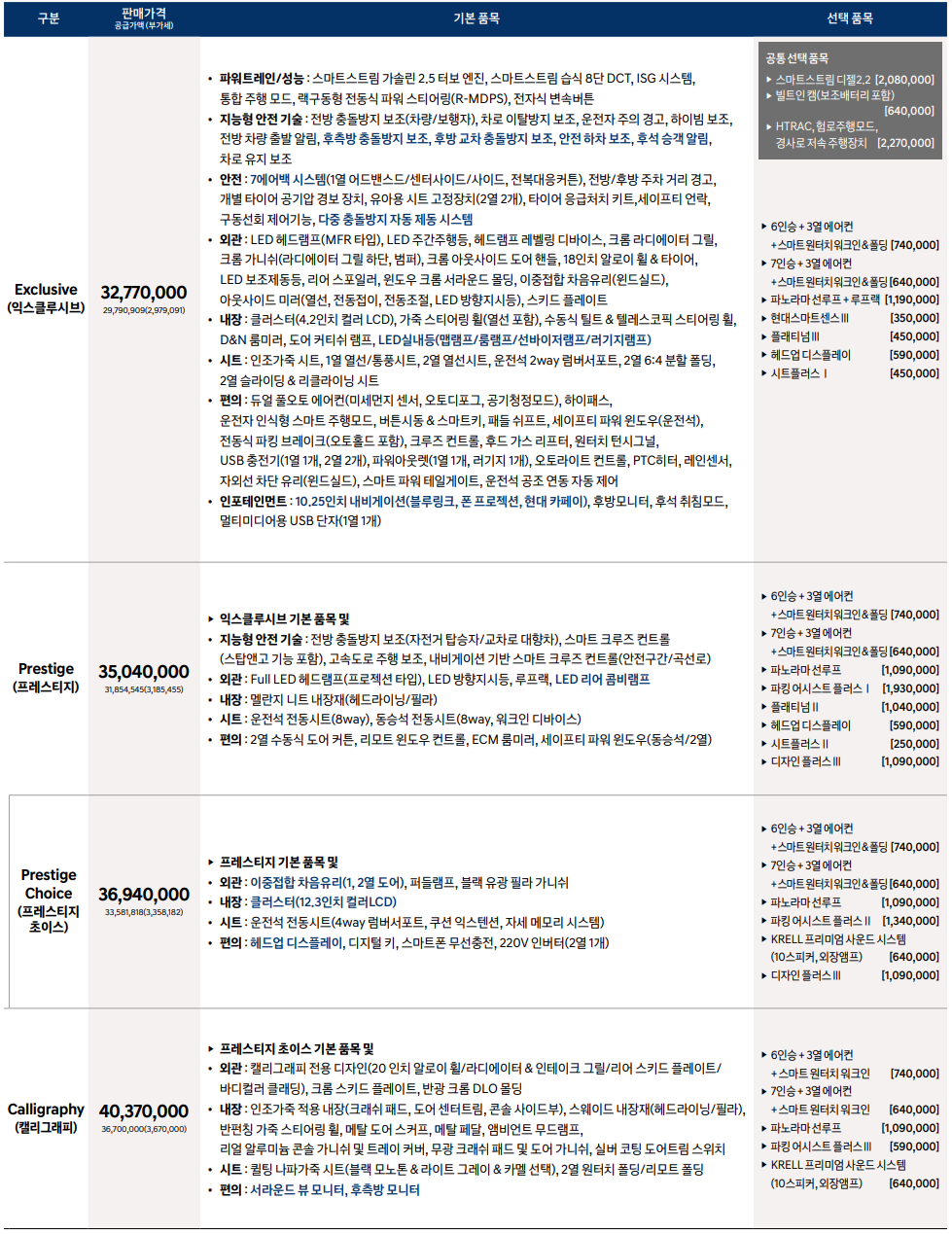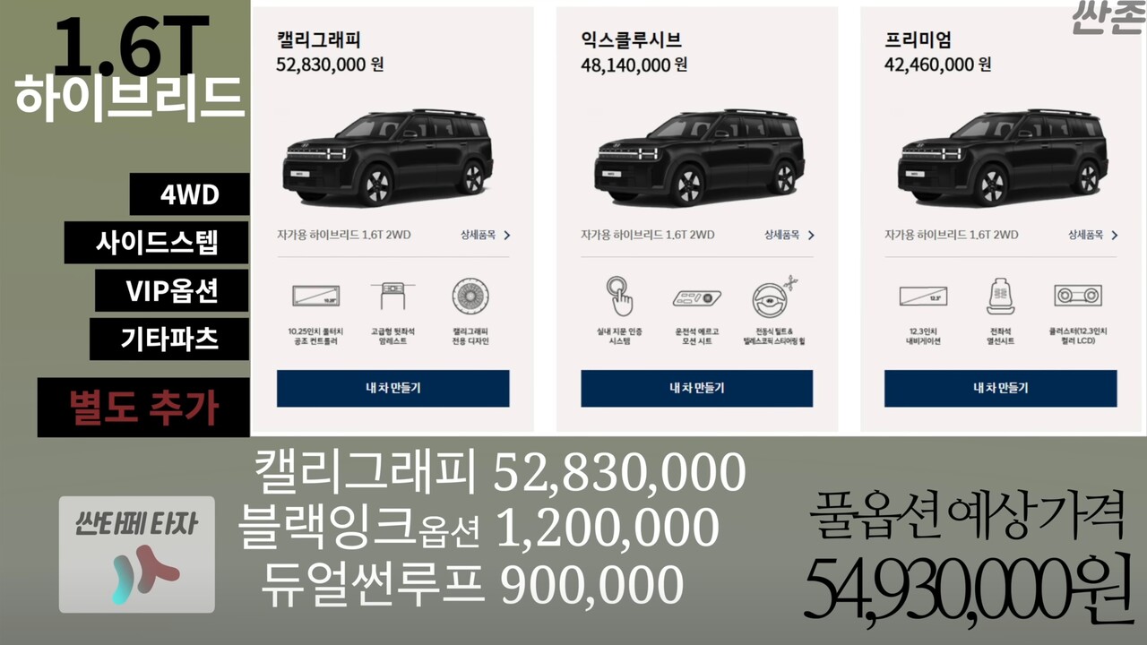 여기에 블랙잉크 옵션과 듀얼 와이드 선루프 등 풀옵션 예상 가격으로 2.5T 가솔린 캘리그래피는 4,850만 원, 1.6T 하이브리드 캘리그래피도 5,493만 원대에 출고될 것으로 예상했는데요, 이는 4륜과 사이드스텝, VIP 옵션과 기타 파츠는 제외하고 계산한 예측 가격입니다.