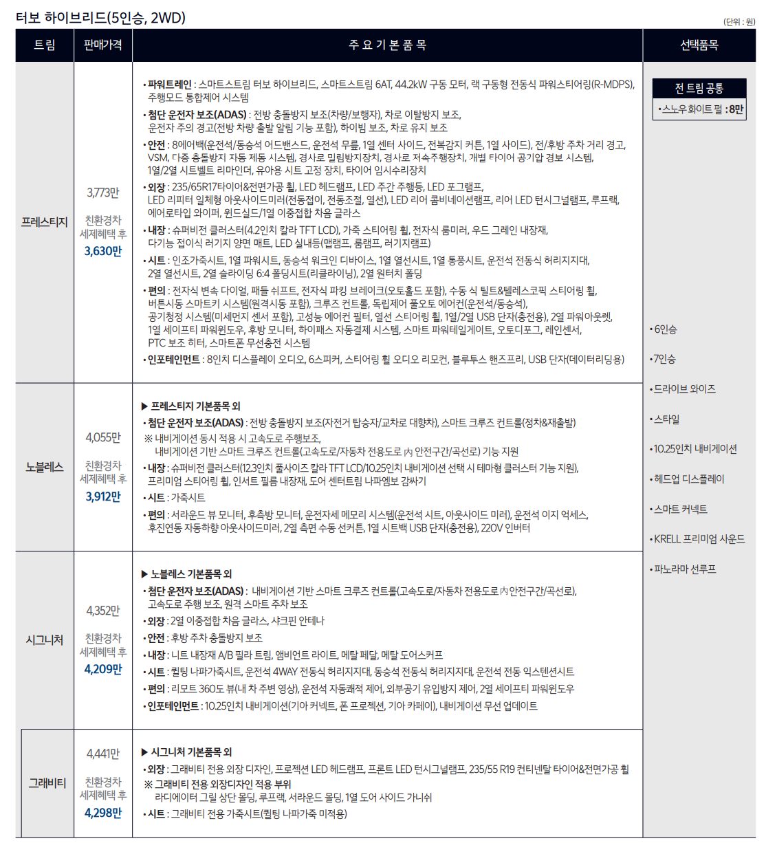 2023 쏘렌토 하이브리드 가격은 개소세 3.5%와 친환경차 세제혜택 반영 기준 다음과 같습니다.