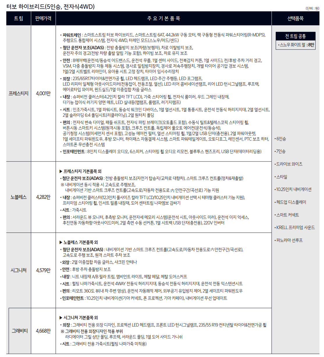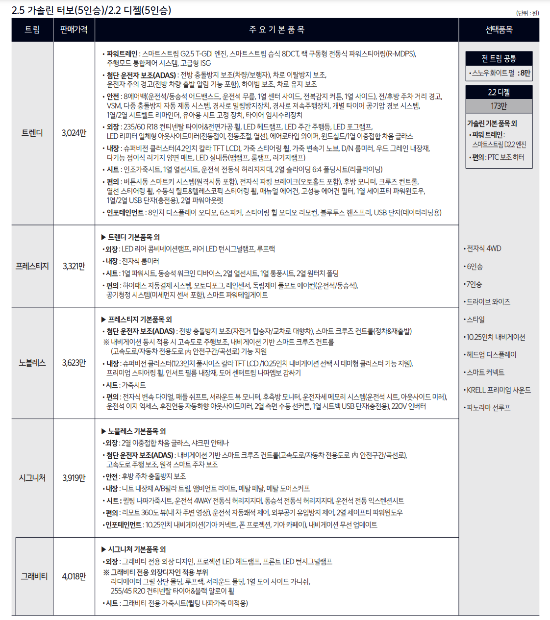 가격은 개소세 3.5% 기준 기존과 비교해 44~45만원 인상된 수준이며 디젤 옵션은 각 트림에 175만원을 추가하면 됩니다.