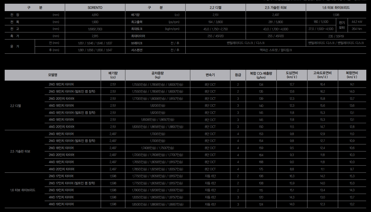 쏘렌토 가격(개소세 3.5%)은 3002만원부터로 세부 가격(개소세 3.5%)은 다음과 같습니다.