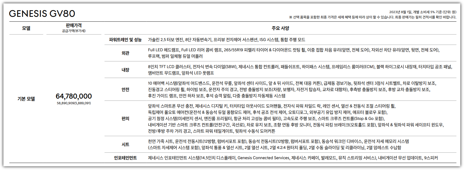 또한 2023년형 GV80 가격을 출시 당시 기준으로 보면 3.0 디젤 6822만원, 3.5 가솔린 터보 6994만원으로 3.5 가솔린 터보 6인승에 2열 모니터와 선루프 등을 추가한 풀패키지 가격은 9622만원선이었습니다.