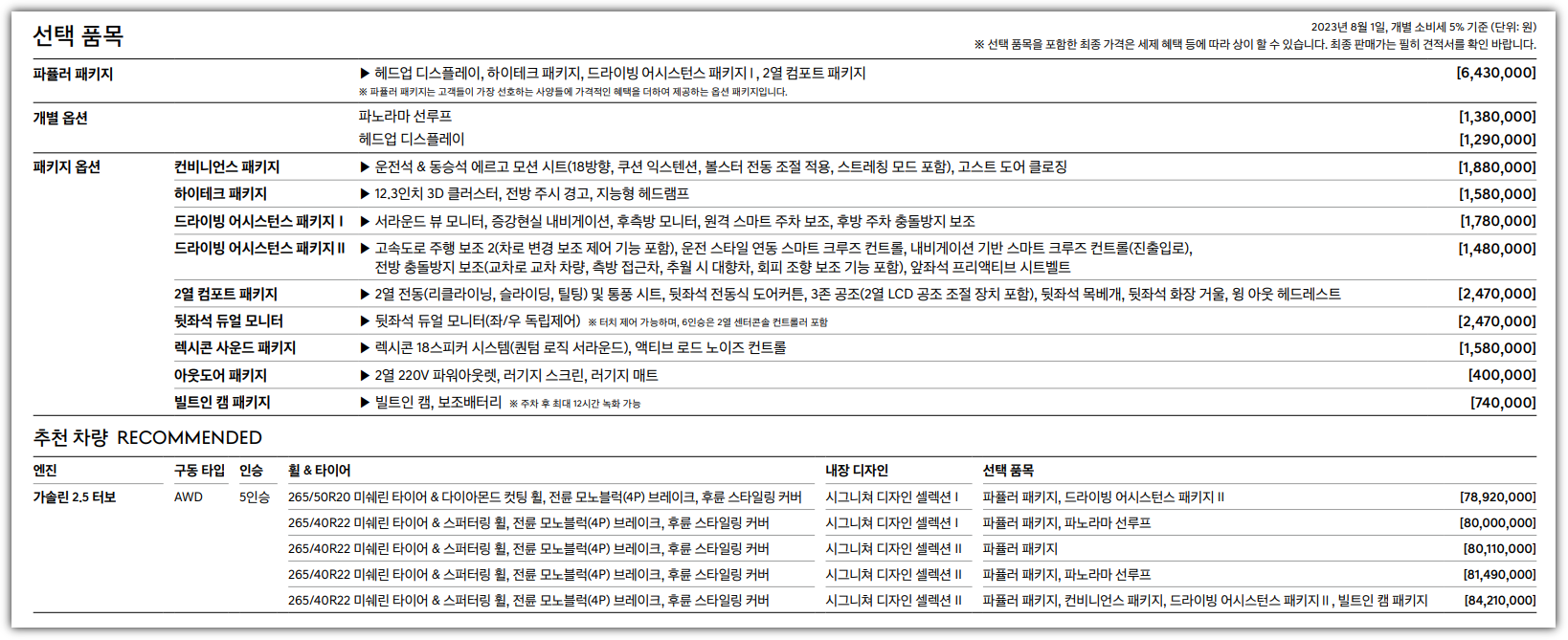 2023년형 GV80 3.5 가솔린 터보 풀패키지에 무광 외장 컬러와 전동식 사이드 스텝, 카본 익스테리어 패키지, 2열 콘솔 냉/온장 컵홀더 등을 적용할 경우 1억307만원선으로 가격이 올라가고 해당 옵션을 제외한 2.5 가솔린 터보 풀패키지 가격은 9172만원, 3.0 디젤 9452만원 정도에서 형성된 바 있습니다.