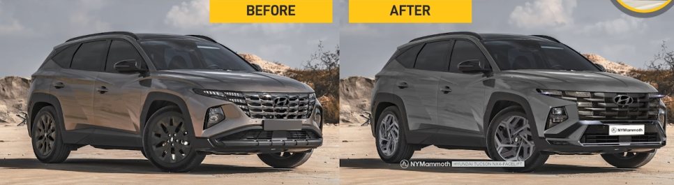 최근 공개된 2024 현대 투싼 페이스 리프트 모델의 렌더링을 보면 새로운 헤드램프와 조금 더 터프한 범퍼를 적용한 모습입니다.