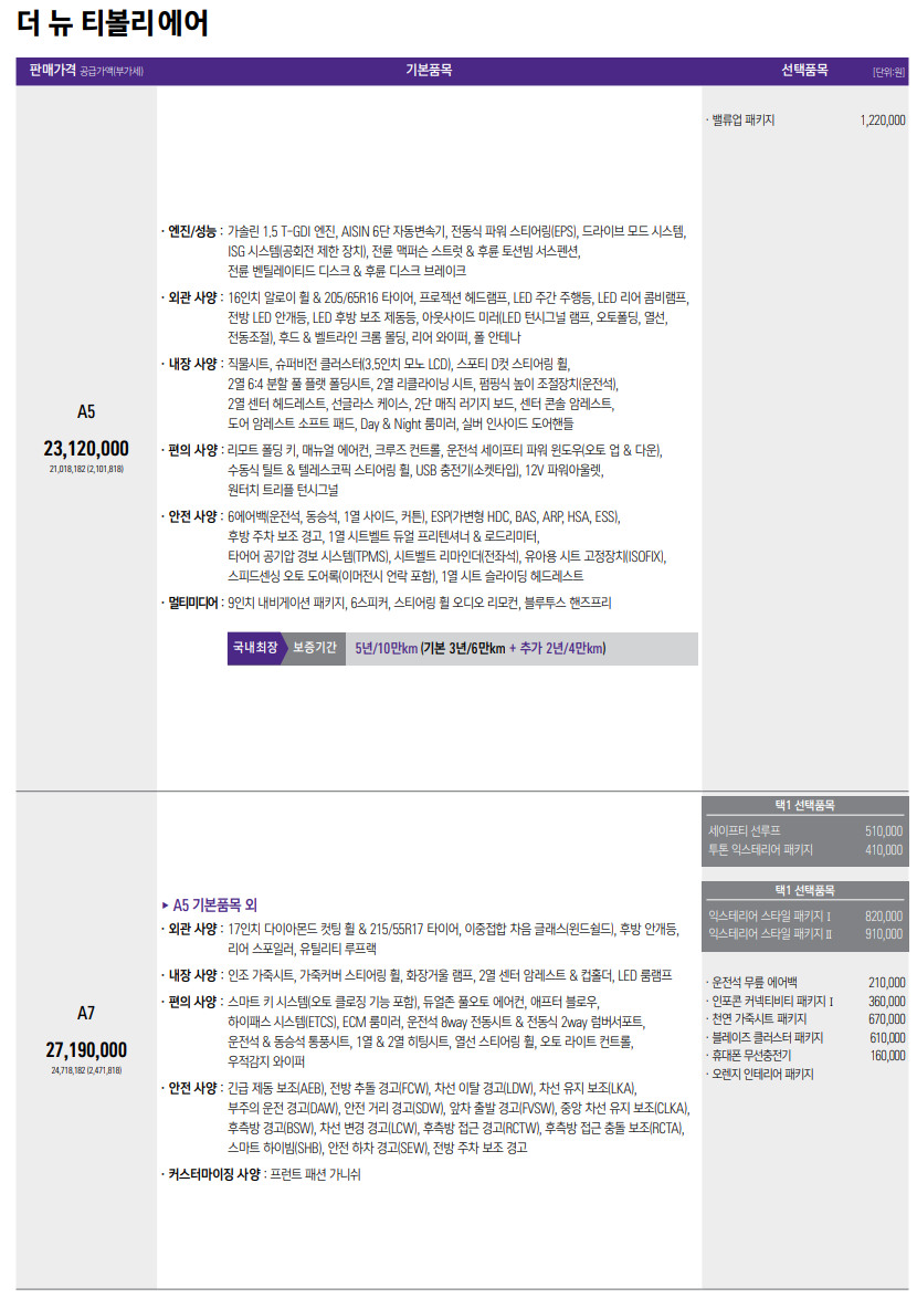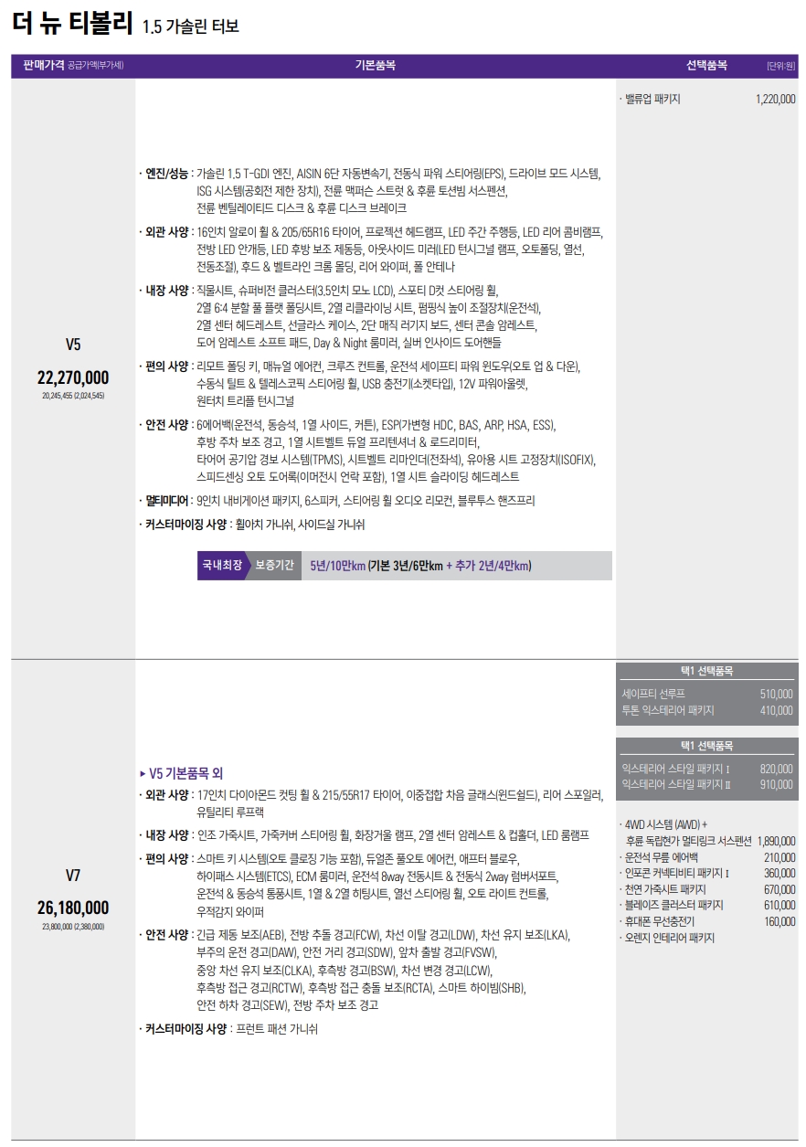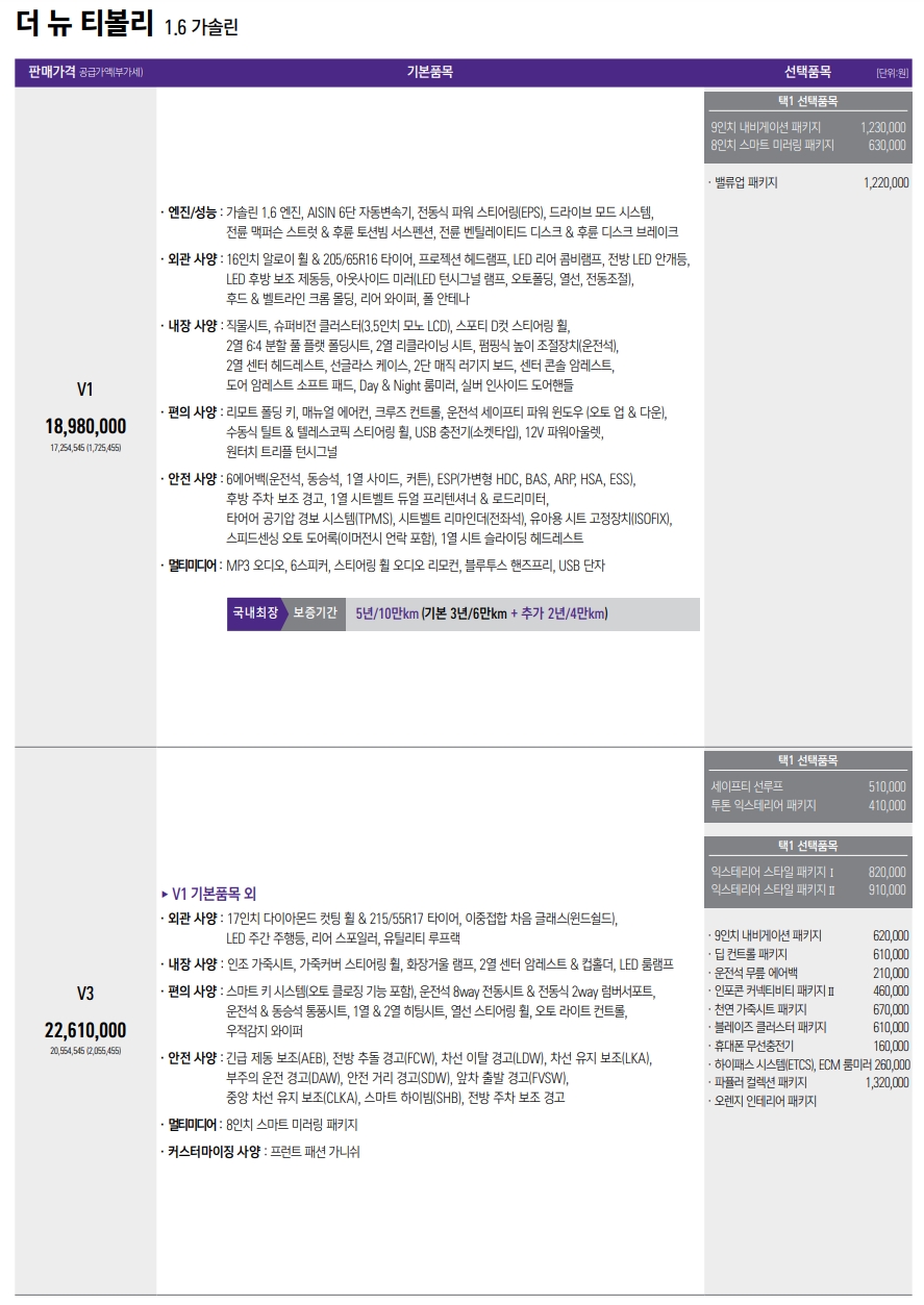 더 뉴 티볼리 및 더 뉴 티볼리 에어의 개별소비세 인하 기준 판매 가격은 엔진 및 트림 별로 다릅니다. 또한 더 뉴 티볼리와 더 뉴 티볼리 에어는 국내 최장의 5년/10만km 보증기간을 시행합니다.