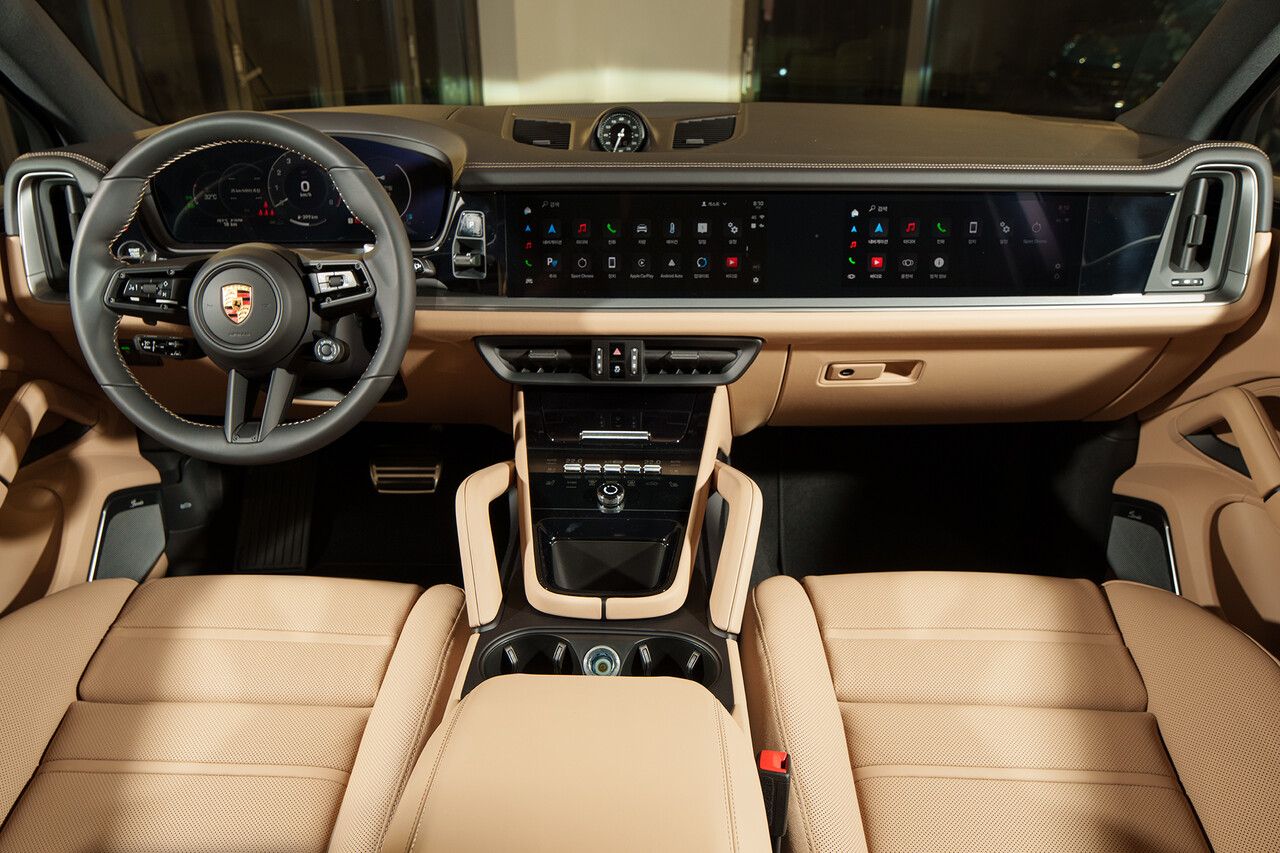신형 카이엔에서는 새로운 인터랙티브 요소가 결합되었습니다. 우선 운전석에는 새롭게 디자인된 독립형 디자인과 가변형 디스플레이 옵션을 갖춘 12.6인치 풀 디지털 계기판이 처음 적용되었으며 최적화된 헤드업 디스플레이는 옵션 사양으로 제공합니다. 대시보드에 12.3인치 센트럴 포르쉐 커뮤니케이션 매니지먼트 (PCM)는 기본 사양으로 통합 적용되었으며 이는 다양한 차량 기능들을 제어할 수 있도록 해줍니다. 특히 스포티파이, 애플뮤직과 같은 앱의 연결성이 최적화 되었다는 점에서 긍정적인 평가를 받고 있습니다.