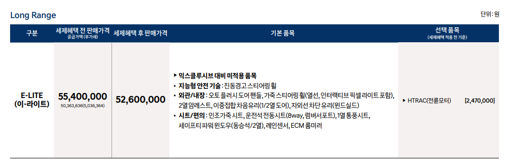 롱레인지 익스클루시브 플러스 트림은 기존 5845만원에서 이번에 5775만원으로 70만원 낮아졌고, 진동경고 스티어링휠·레인센서 등 상위 트림에 들어가던 기능을 기본형에도 들어가 있습니다. 게다가 최상위 트림에서 고를 수 있던 45만원짜리 오디오 옵션도 그냥 넣어주고 선호도가 높은 옵션을 한데 묶은 기념패키지를 내놓으면서 가격을 낮춘 것인데요, 얼마나 많은 운전자들의 선택을 받을 수 있을지 지켜봐야겠습니다.