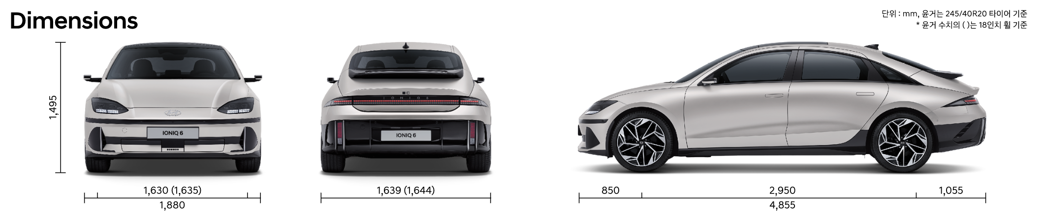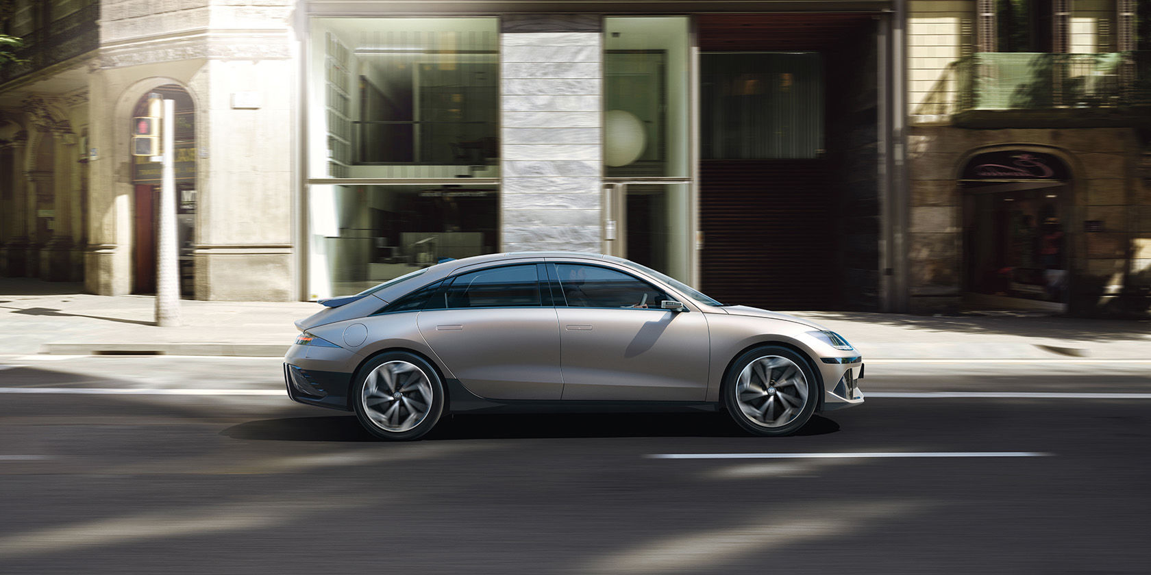 아이오닉6는 현대차그룹 전기차 전용 플랫폼 E-GMP를 기반으로 제작된 중형 세단으로써 차체 크기는 전장 4855mm, 전폭 1880mm, 전고 1495mm, 휠베이스는 2995mm입니다. 전체적인 차체 크기는 현대차 쏘나타(4900mm)와 유사하다고 볼 수 있는데요, 휠베이스는 그랜저(2885mm)보다 길고 공기저항이 최소화됐습니다.