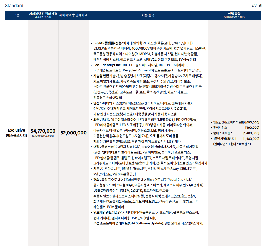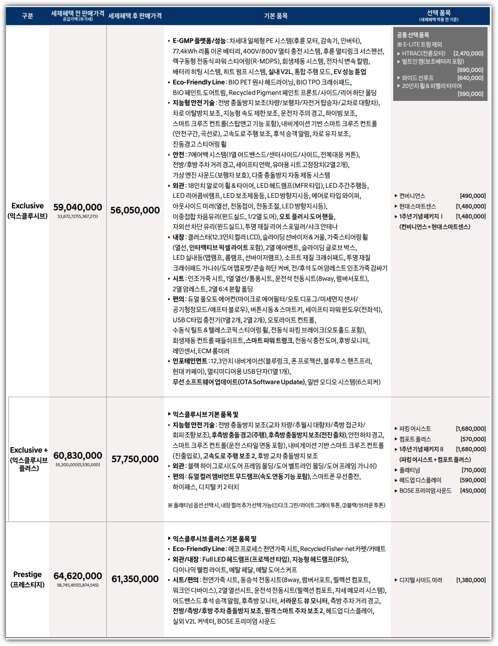 현대자동차는 익스클루시브 플러스 트림을 고객 최선호 사양으로 재구성하면서 판매 가격이 70만원 인하되었으며 이외 트림도 선호 사양 기본화 했지만 가격을 동결해 전반적으로 가성비를 끌어 올렸다는 설명입니다.
