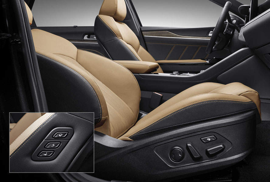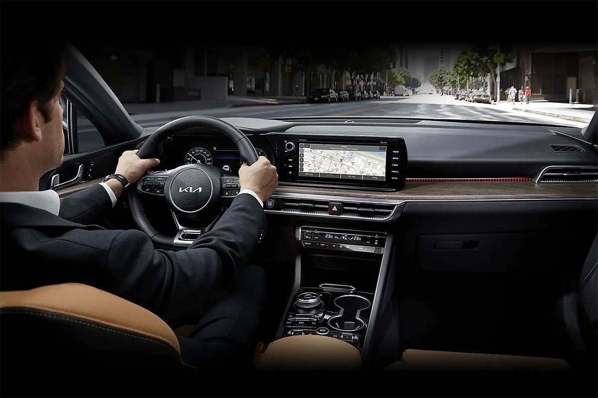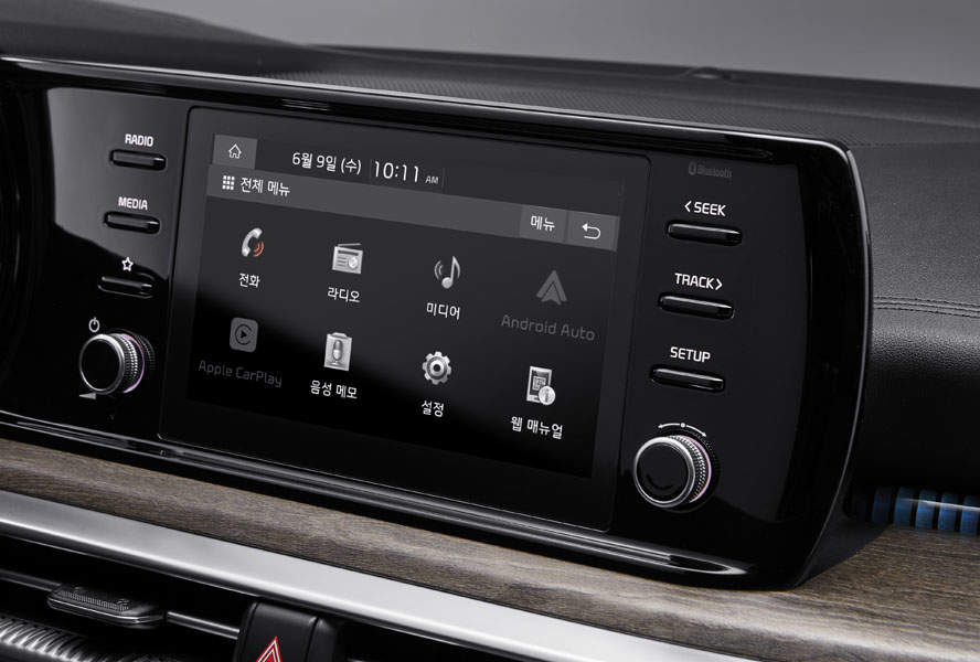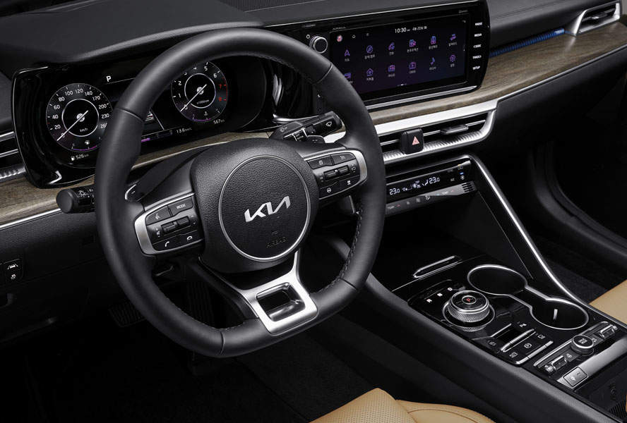 기아 K5 실내 분위기는 전체적으로 변속기 디자인을 개선하고 스티어링 휠을 감각적으로 제작해 이전 세대 모델과는 확실히 다른 분위기를 풍기는데 마감재 역시 고급스러운 느낌을 줍니다.
