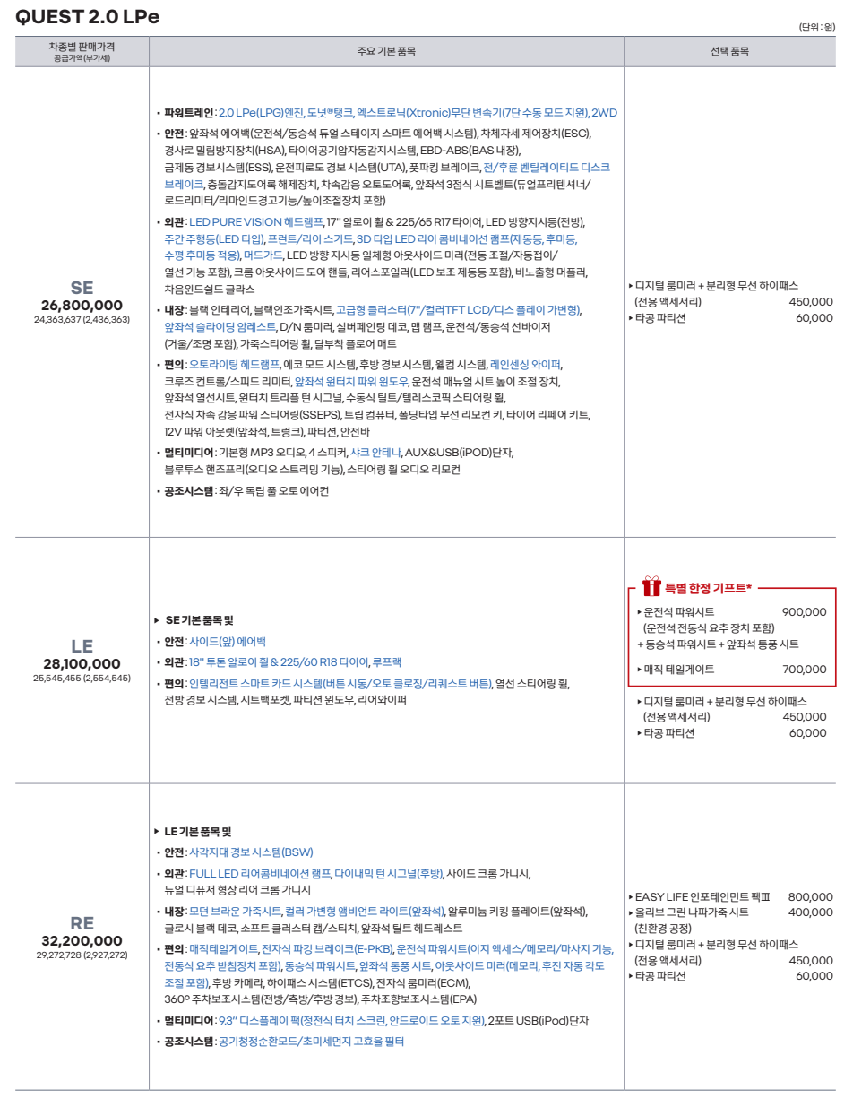 가성비 SUV의 대명사였던 QM6이기는 하지만 르노코리아 QM6 LPe 역시 올해 페이스 리프트 모델을 내놓으면서 가격이 인상됐습니다. QM6 LPG 가격표를 보면 약 100만원 정도 올랐는데요, 내외관에서 개선점이 있다는 점에서 납득할만하다는 평가입니다.